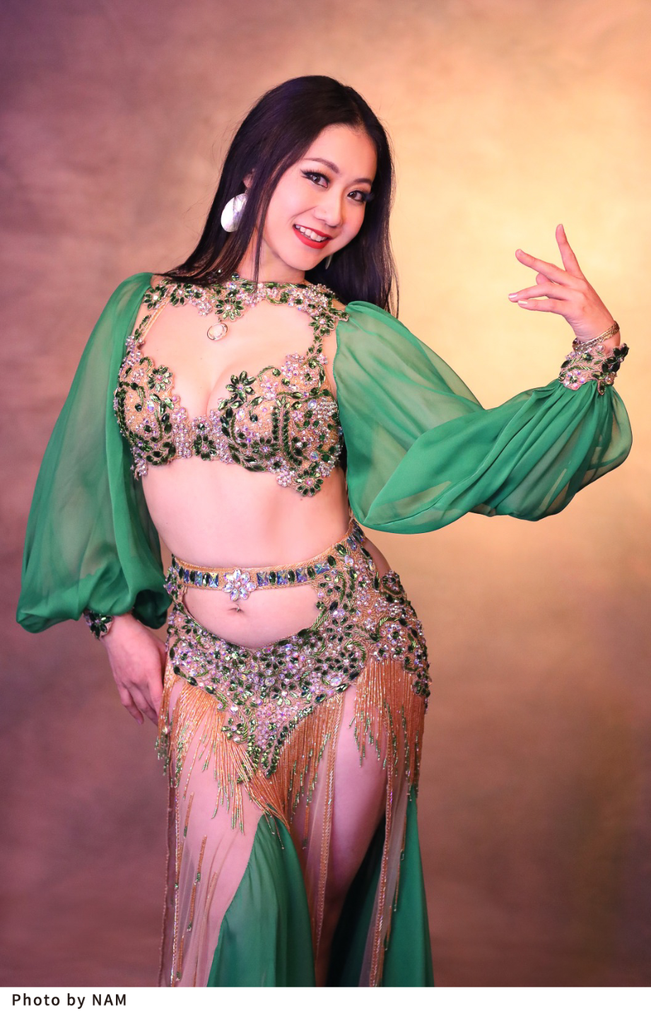 芸術的なバックグラウンドを持ち、ベリーダンスの枠に収まることなく、お能や日本独自の精神性を宿した「葵舞」など、普遍的な舞踊表現を追求し続けています。