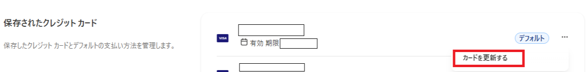 6. 「保存されたクレジットカード」から、設定の変更を行いたいカード情報の右端にある、「…」をクリックし、出てきたメニューから「カードを更新する」をクリックする
