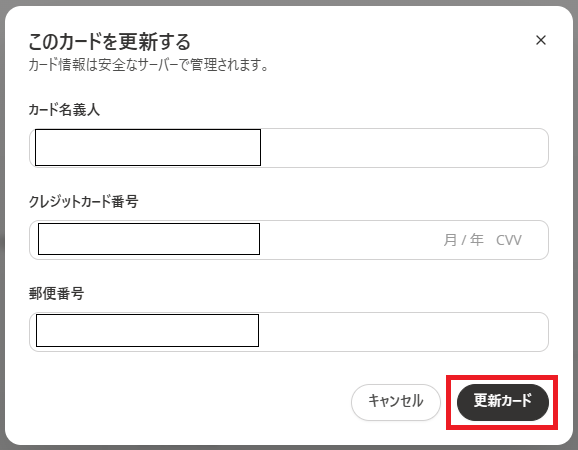 7. 新たに登録したいカード情報を入力して更新カードをクリックして更新完了!